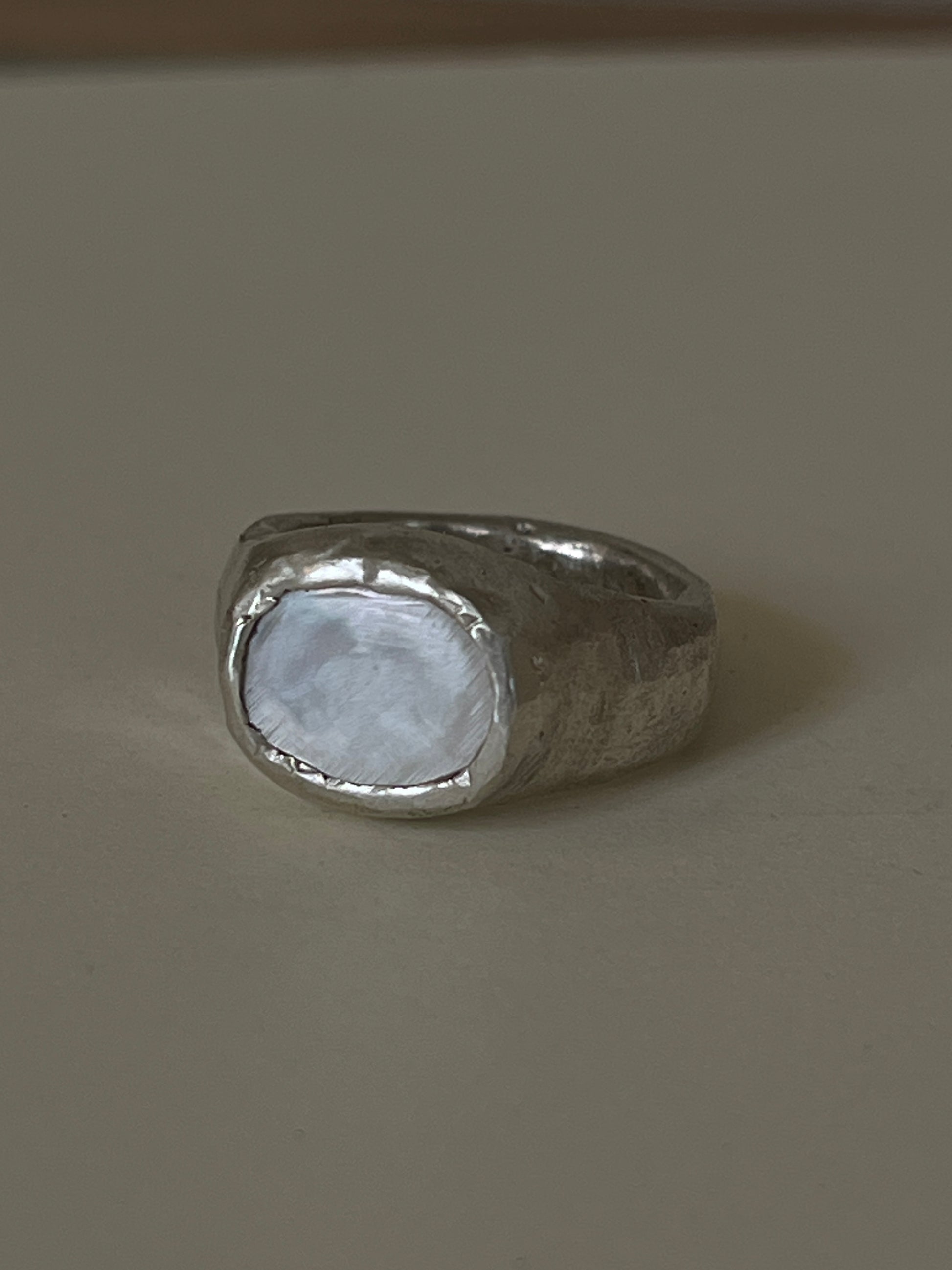one of a kind, vintage mother of pearl set in a chunky sterling silver band